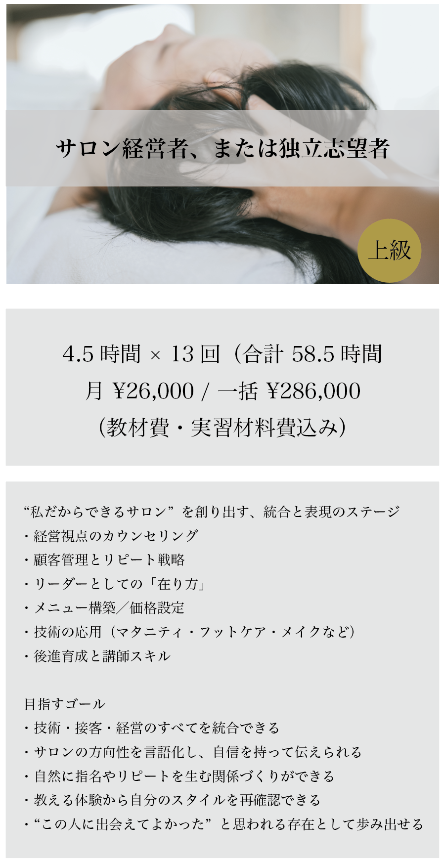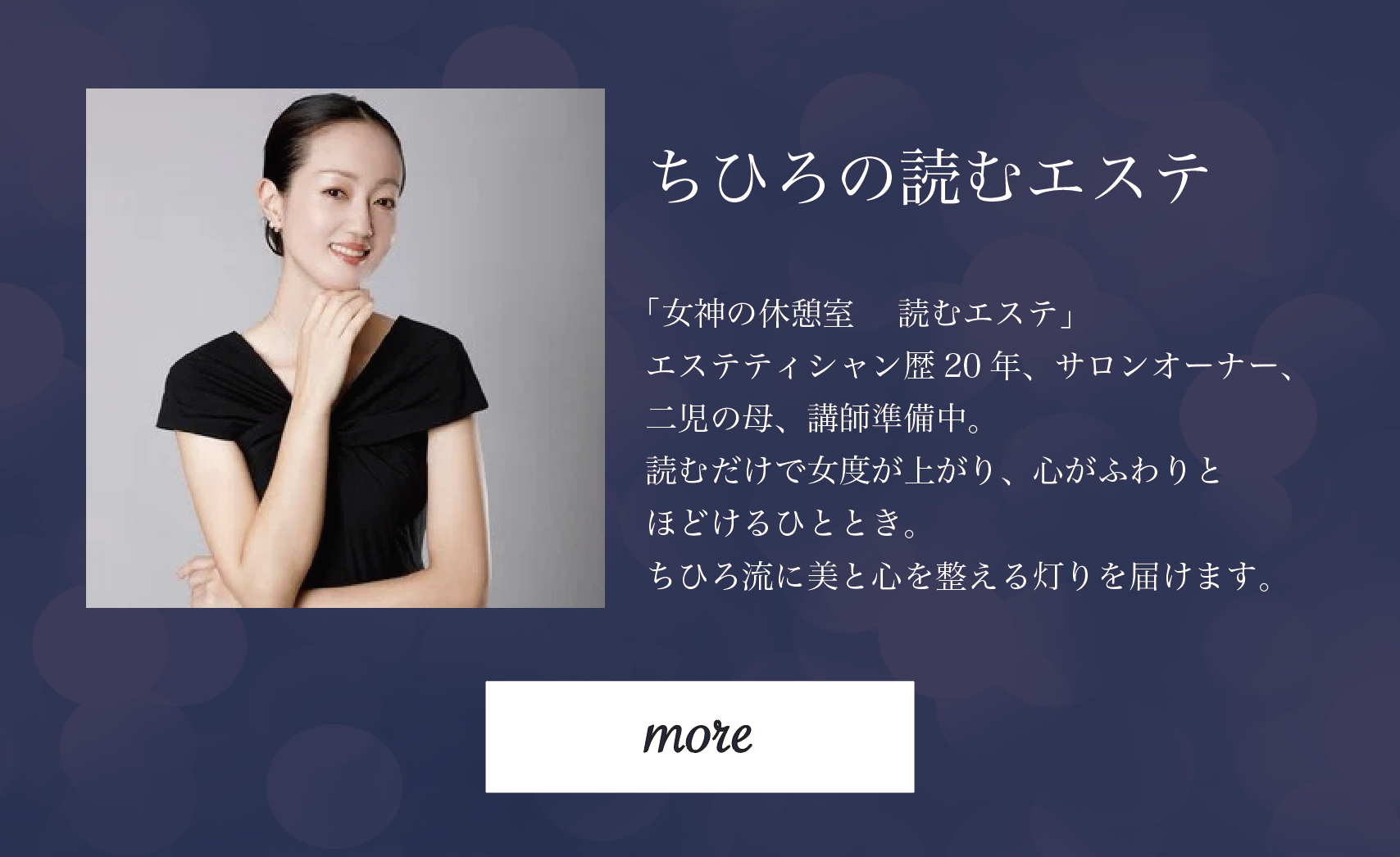 エステティシャン歴20年 美容専門学校エステティック科を卒業後、株式会社ソシエ・ワールドに入社。 フランスの高級化粧品ブランド「ゲラン」に配属され、認定ディプロマを取得。 ホテルオークラ内サロンにて6年間、国内外のVIP対応を含むトリートメントを担当し、一流の技術とおもてなしを現場で徹底的に学ぶ。 2011年、神戸にてプライベートサロン Saphir(サフィール)を開業。 「お客様一人ひとりに心から寄り添う姿勢」が口コミで広がり、14年以上にわたり多くの方々に支持を受け続けている。 これまでに延べ1万人以上を施術。 「手を尽くすとは、愛を尽くすこと」という信条のもと、結果と癒しの両立を追求してきた。 美容理論の裏付けとして日本化粧品検定1級・特級コスメコンシェルジュ資格を取得。 確かな理論と経験を組み合わせ、肌と心に寄り添うトータルケアを提供する。 現在は、確かな技術と心の在り方を次世代に伝えるエステ講師としても活動。 原点は常に「お客様お一人おひとりと丁寧に向き合うこと」。 “手を尽くす=愛を尽くす”という思いを胸に、癒しと結果を追求し続ける。 |