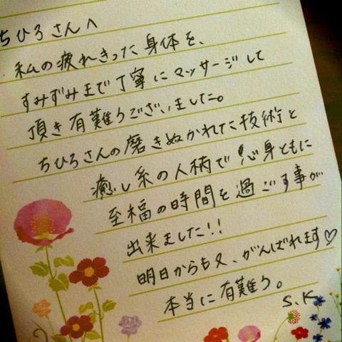 私の疲れきった身体を、すみずみまで丁寧にマッサージして頂き有難うございました。
