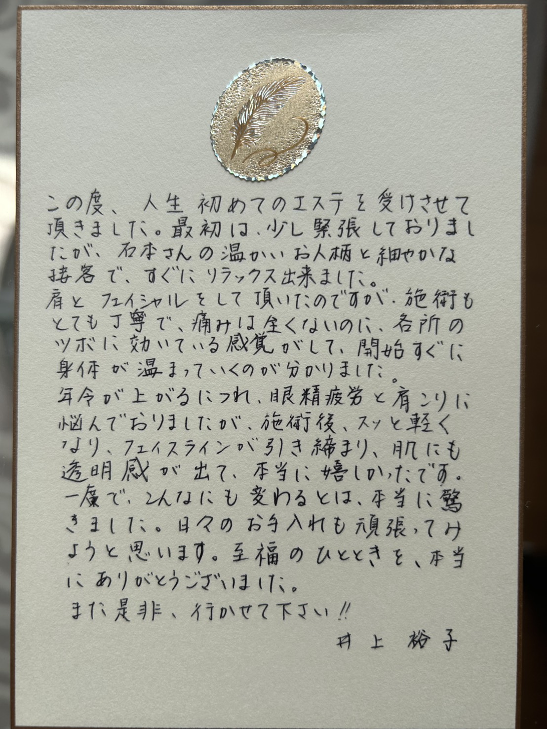 この度、人生初めてのエステを受けさせて頂きました。最初は少し緊張しておりましたが、石本さんの温かいお人柄と細やかな接客で、すぐにリラックス出来ました。