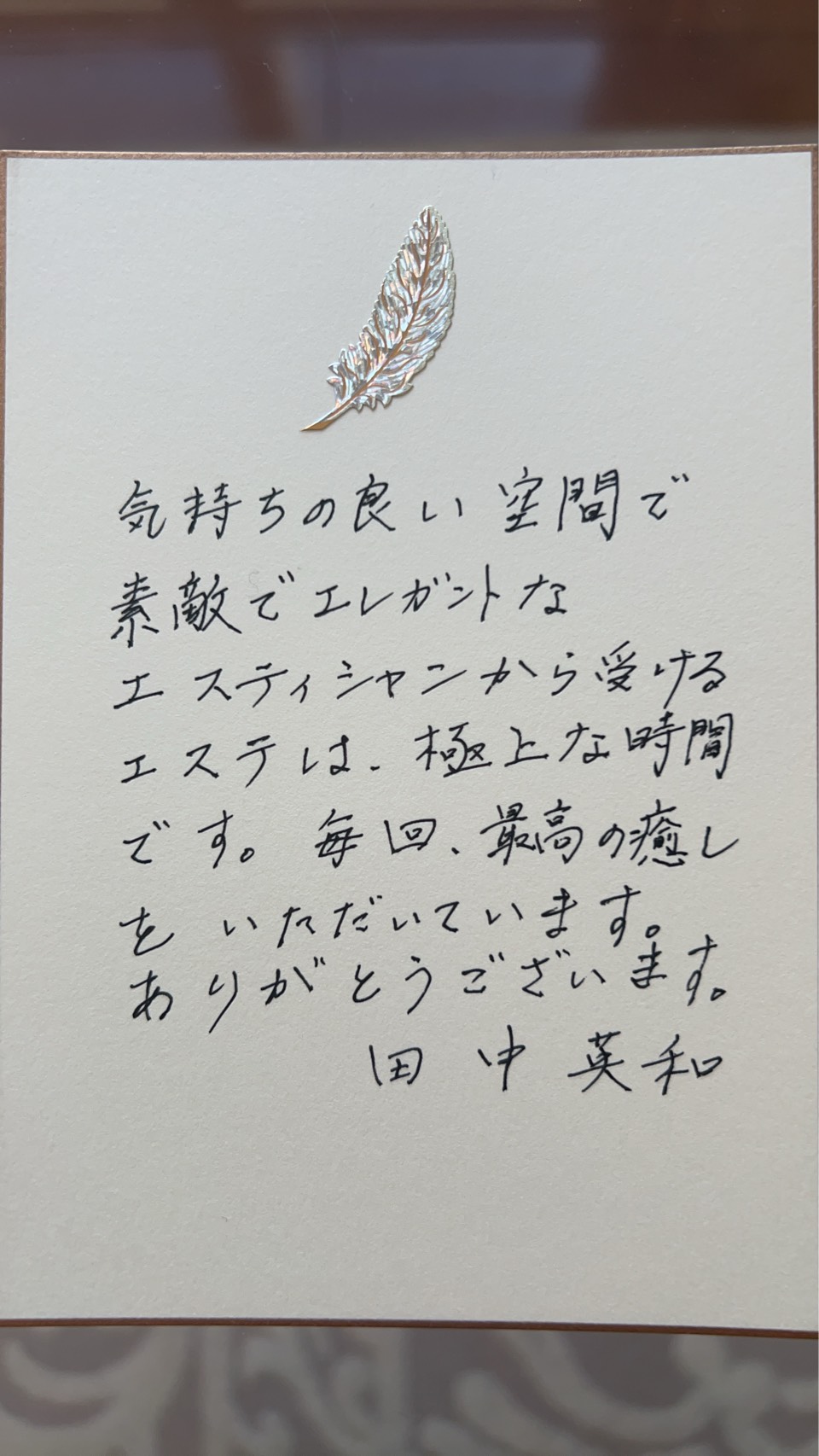 毎回最高の癒しをいただいています/田中様 気持ちの良い空間で 素敵でエレガントな エステティシャンから受ける エステは、極上な時間です。 毎回、最高の癒しを いただいています。 ありがとうございます。 田中 英和