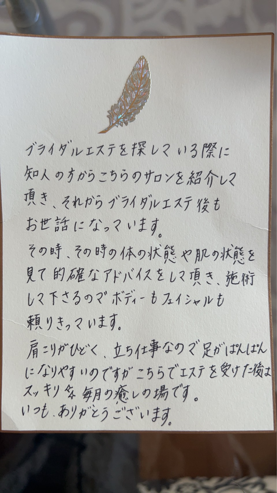 的確なアドバイスと施術に頼りきっています/M•T様 ブライダルエステを探している際に知人からこちらのサロンを紹介して頂き、それからブライダルエステ後もお世話になっています。その時、その時の体の状態や肌の状態を見て的確なアドバイスをして頂き、施術して下さるのでボディーもフェイシャルも頼りきっています。肩こりがひどく、立ち仕事なので足がぱんぱんになりやすいのですが、こちらでエステを受けた後はスッキリ✨毎月の癒しの場です。いつもありがとうございます。